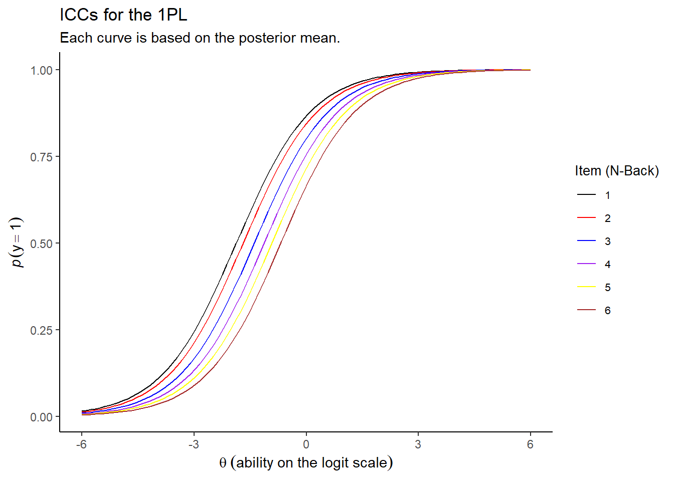 Nice. The 1PL model shows what we would expect from increasing N-Back: that the difficulty of each item increases with the N trials ago that someone is trying to remember.